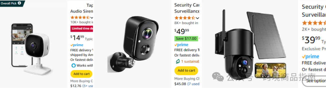 智能监控摄像头核心卖点集中在无线连接、AI人形检测、云存储、双向语音等功能,亚马逊主流价格带为120刀左右,高端款(如太阳能供电、4K分辨率)可达$300+。其市场优势在于: