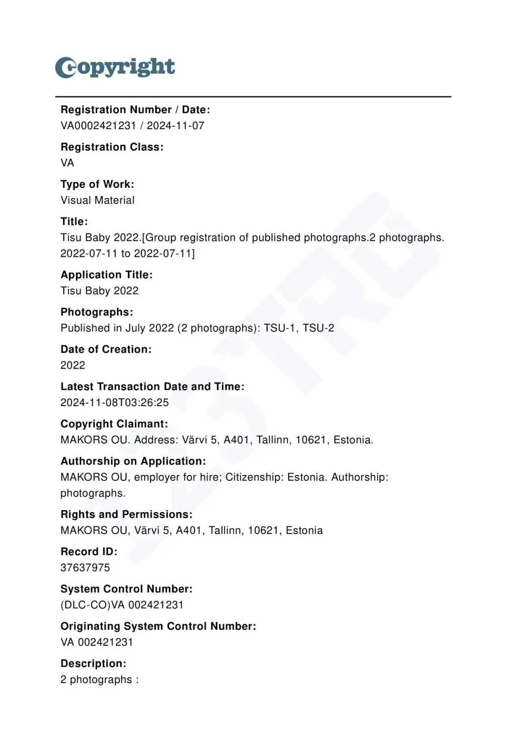 原告MAKORS OU名下有一条名为“Tisu baby”的版权,Tisu的明星产品是哺乳遮盖巾,也有售各种婴儿必备用品,包括婴儿寝具、襁褓毯等产品。