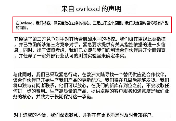目前亚马逊保健软糖大卖Ovrload发布了一份宣布停止运营声明,该声明重点强调:因为源于第三方竞争对手关于我们产品中肌酸含量的指控,同时客户满意度才是公司核心业务目标,由此我们决定暂时暂停所有产品的销售。