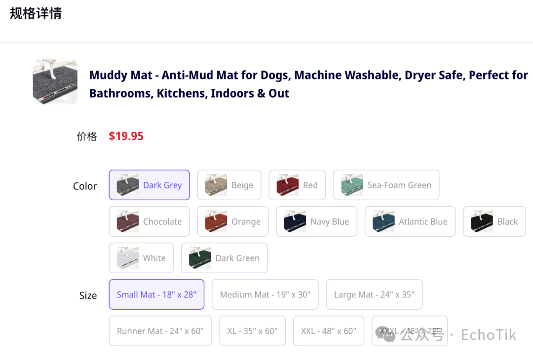 这款地垫根据颜色和尺寸分为77种不同的规格,价格在19.95至129.95美金之间,总销量近4万件,预估GMV高达265万美元。