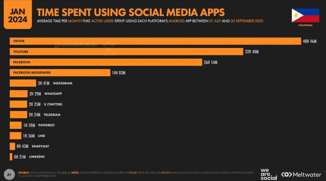 《2024年全球数字报告》数据显示, 菲律宾人每天使用社交媒体的时间为3小时34分钟,他们每天在TikTok上花费的时间为 1.36小时,大约是在 Facebook 上花费时间的1.5倍,远超日常社交对话的时间。