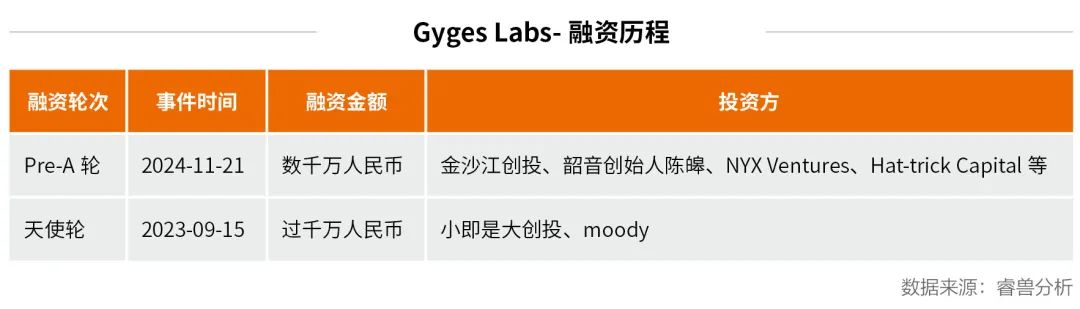 2024年11月,Gyges Labs完成了数千万元Pre-A轮融资,投资方包括金沙江创投、韶音创始人陈皞、NYX Ventures、Hat-trick Capital等。
