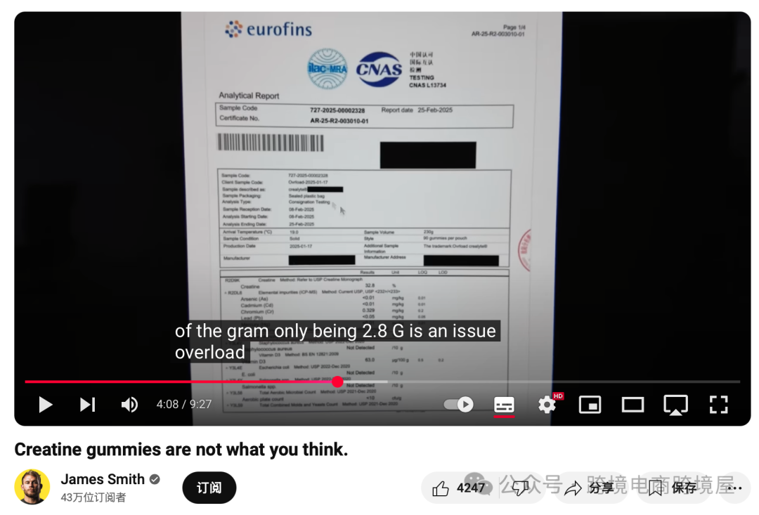 该网红博主在其视频内点名指出Ovrload的肌酸软糖存在问题,顺带还附上一份中国检测机构的报告。